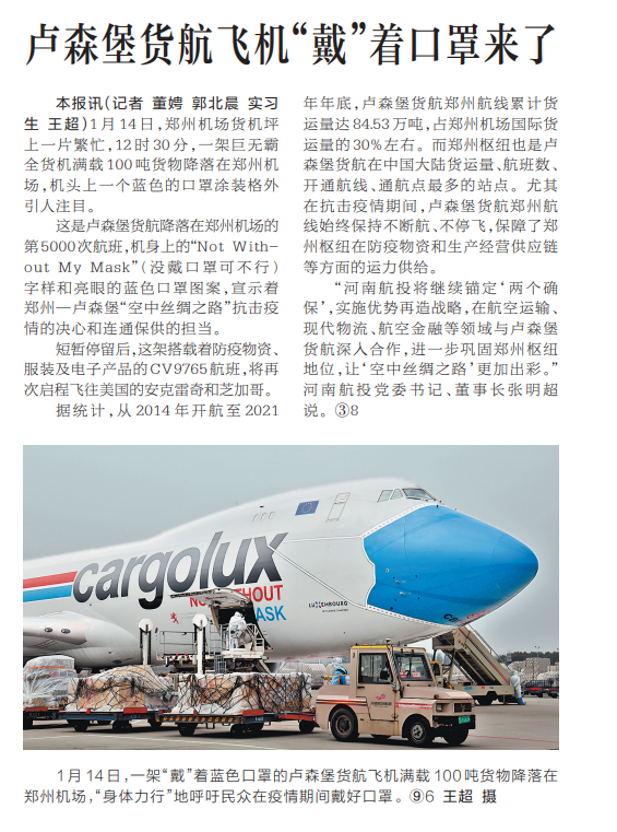 這是盧森堡貨航降落在鄭州機(jī)場(chǎng)的第5000次航班,機(jī)身上的“NotWith-outMyMask”(沒(méi)戴口罩可不行)字樣和亮眼的藍(lán)色口罩圖案,宣示著鄭州—盧森堡“空中絲綢之路”抗擊疫情的決心和連通保供的擔(dān)當(dāng)。
